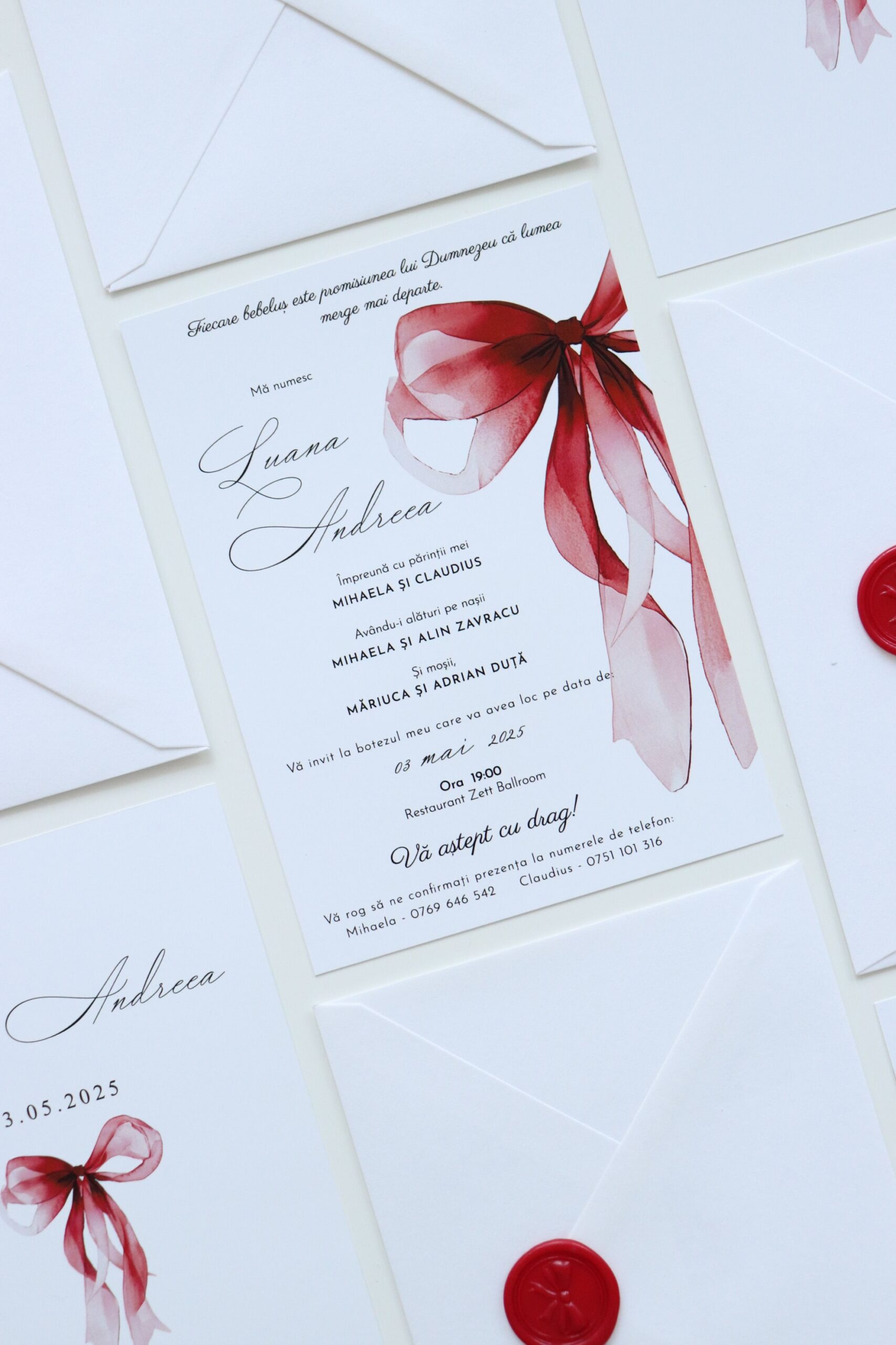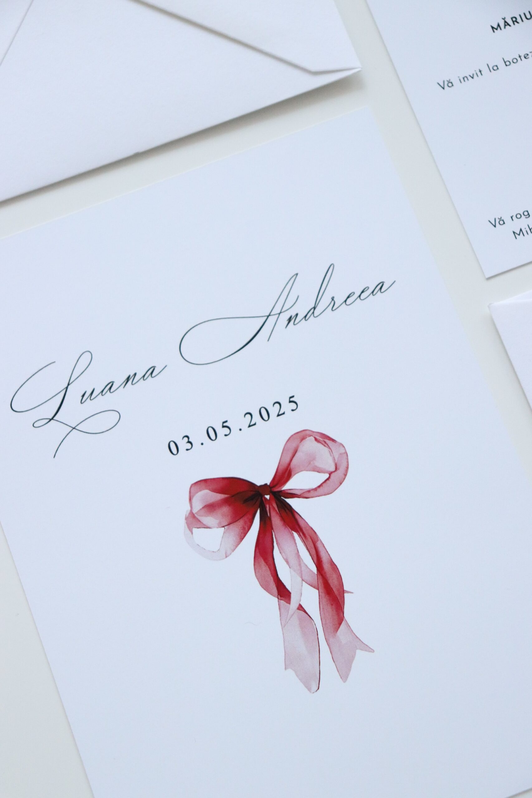 Invitația cu fundă roșie aduce o notă de rafinament și naturalețe, încântând fiecare invitat.