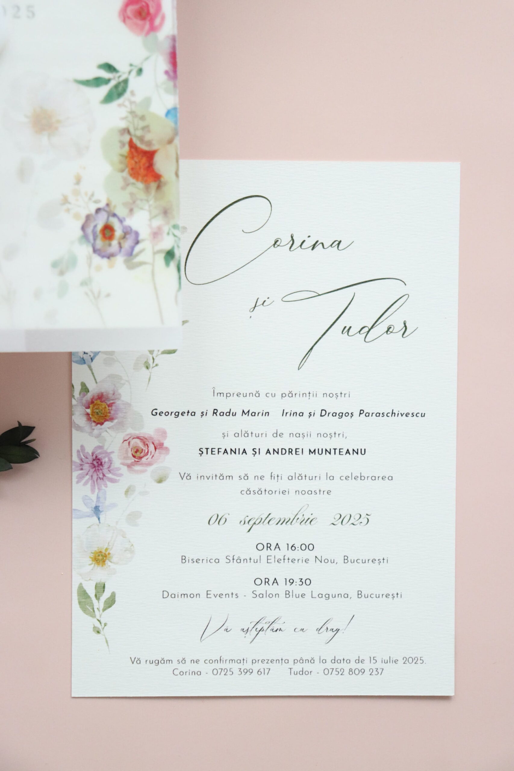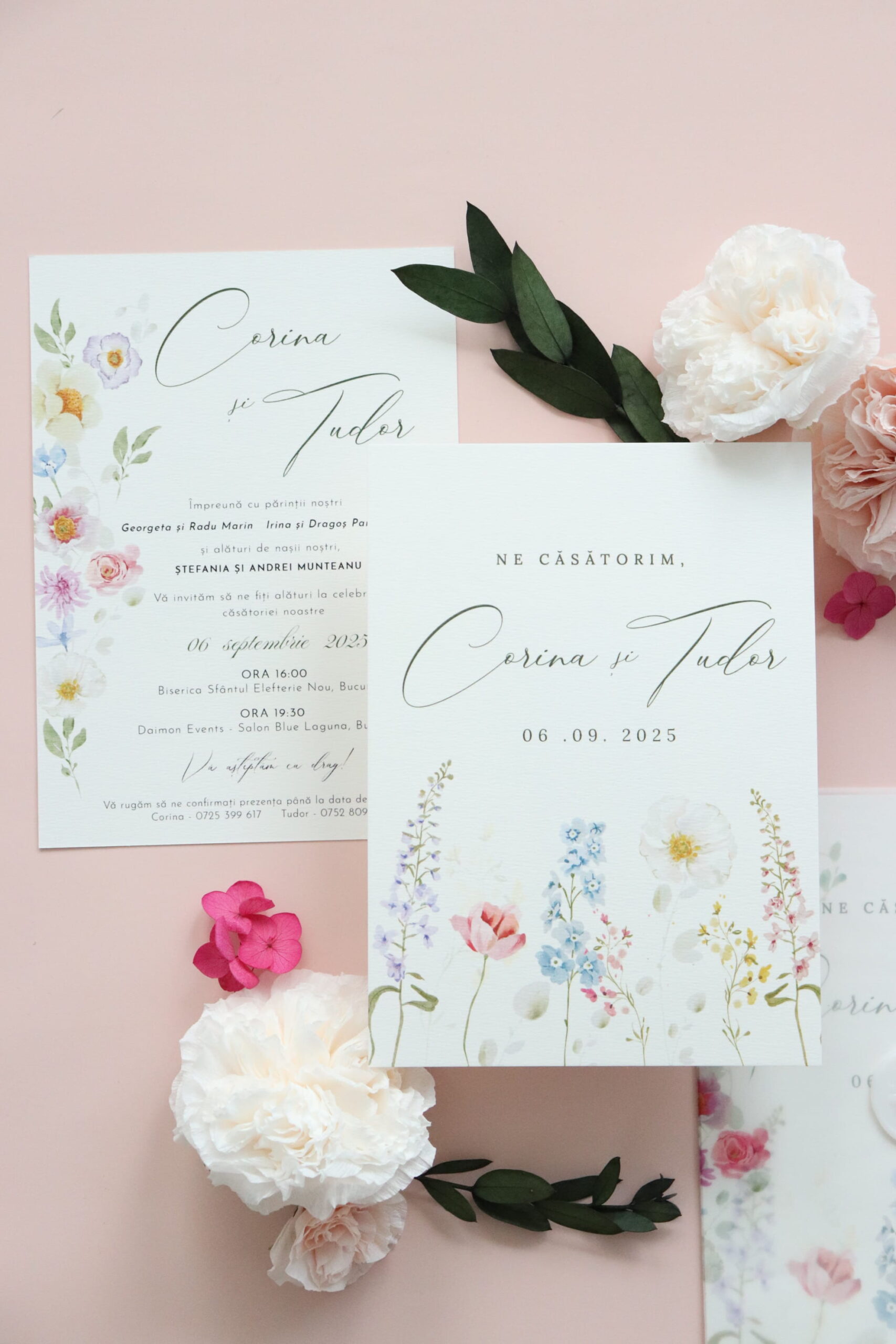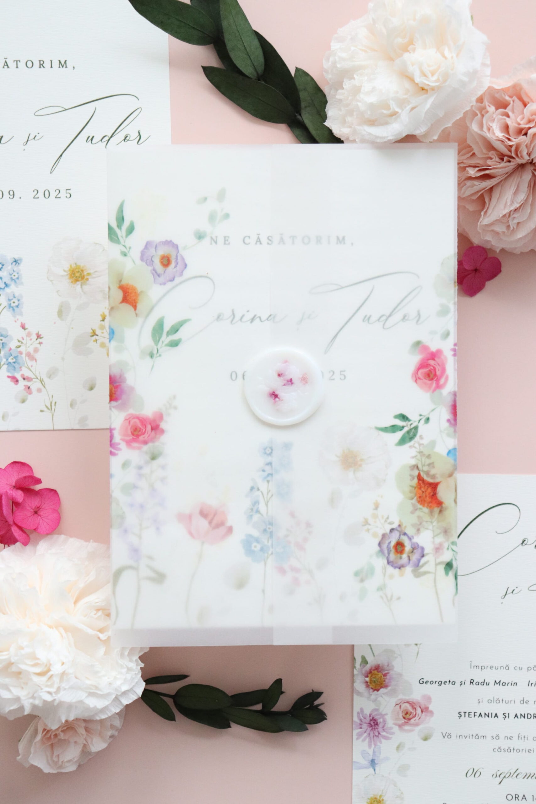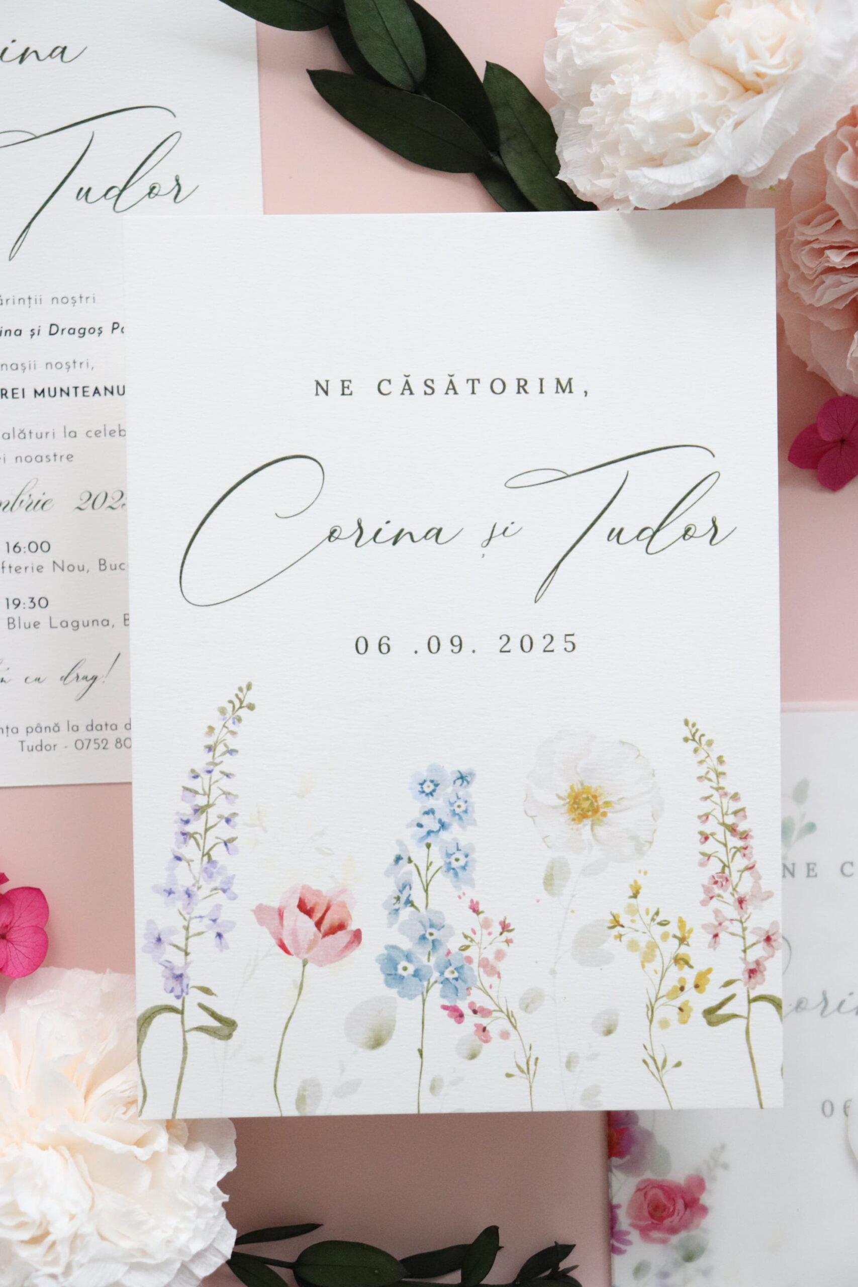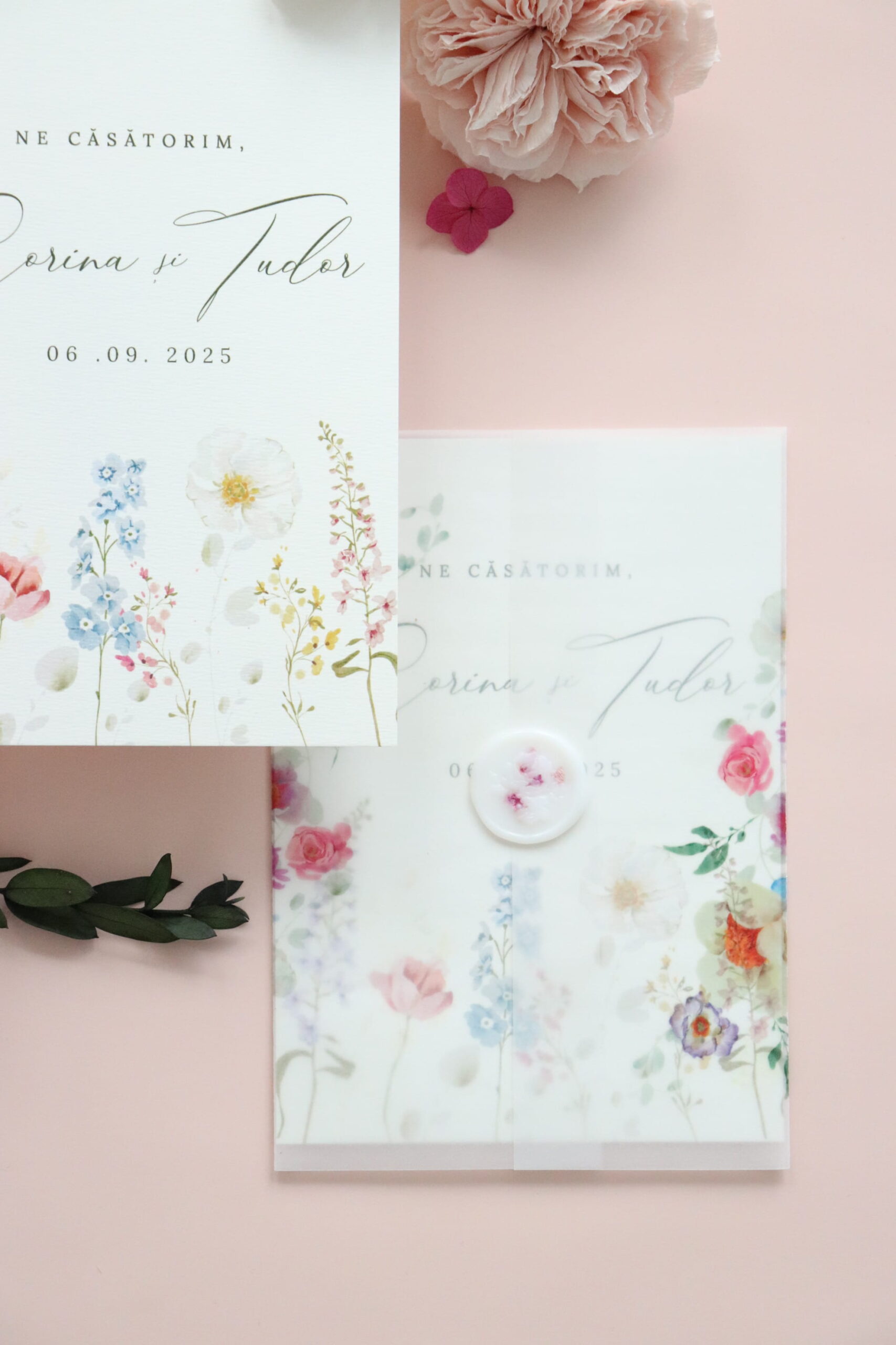 *Ne putem ocupa și de restul papetăriei pentru nuntă astfel încât accesoriile să fie în acord cu designul invitațiilor.
